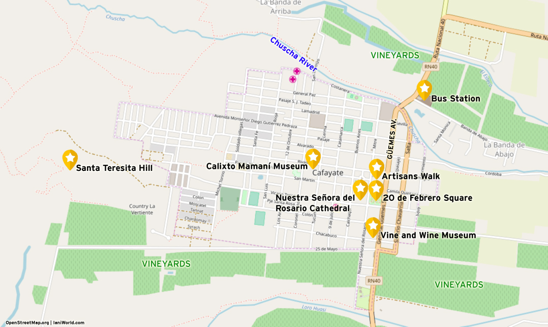 The main avenues of Cafayate are Bartolomé Mitre and General Güemes Norte. Both circulate in parallel across the city.